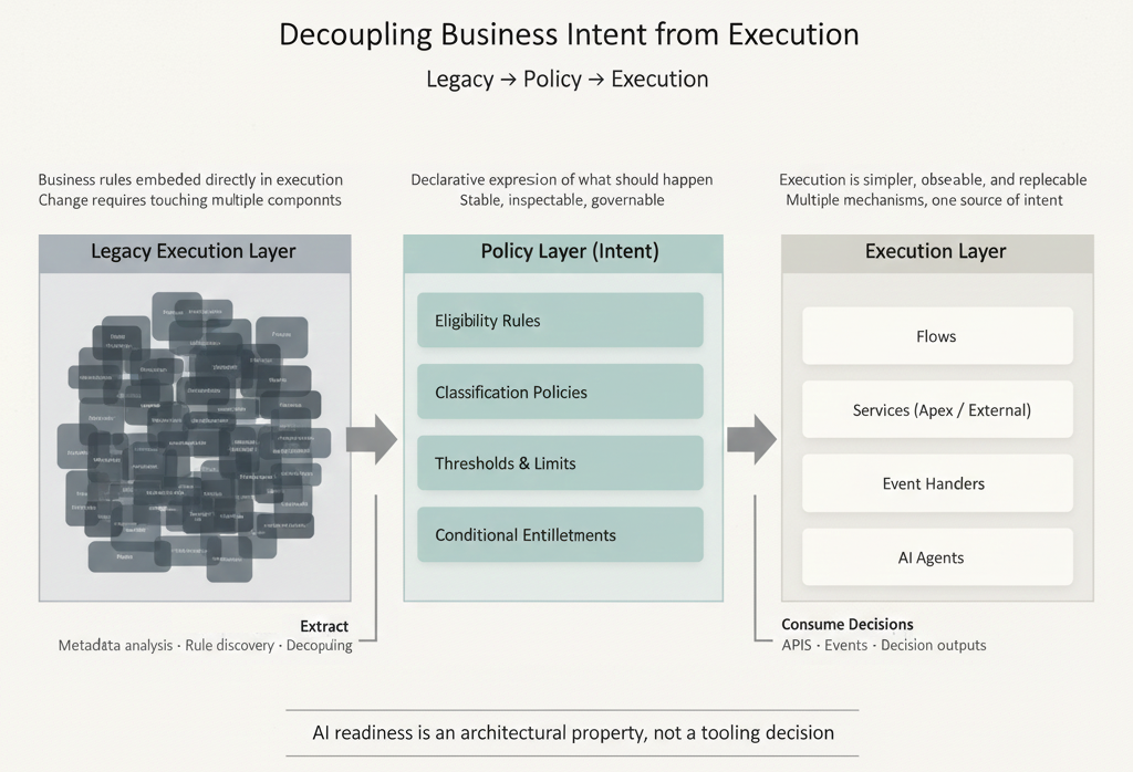 Flows, Apex, integrations, and agents consume policy decisions rather than encoding them. Execution becomes more uniform, more testable, and more observable. Multiple execution mechanisms can coexist because intent is no longer hard-wired into any single one.